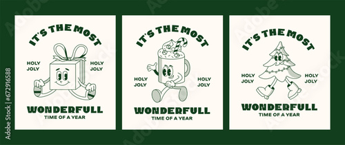 Christmas and New Year retro cartoon characters label template poster set. Present, cup, tree, bauble. Merry xmas Vector mascot groovy illustration in trendy vintage comic style isolated on background