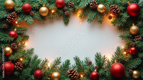 Christmas and New Year's card: fir branches with shiny ornaments and stars, empty space in the center