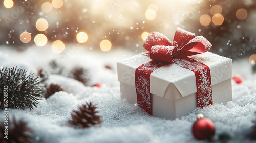 Christmas background featuring a white gift box and a blank caption space, ideal for adding your personalized holiday message or greeting