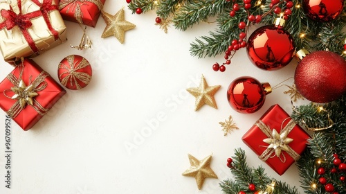 Christmas Background, Red Ornaments, Golden Gifts, And Fir Branches On White Surface, Copy Space