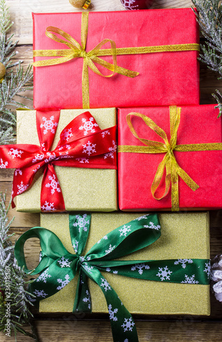 Christmas background with decorations and gift boxes on wooden background. Top view