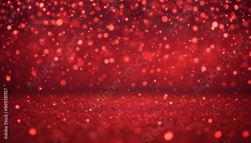 Christmas Background with Red Abstract Shiny Particles. Valentine Day Red Glitter Bokeh Bright Lights. Happy Holidays and New Year Defocused Sparkle Abstract Texture.
