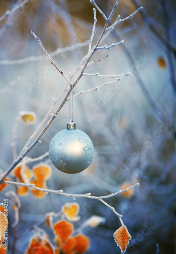 Christmas ball hanging on a tree branch in the winter forest