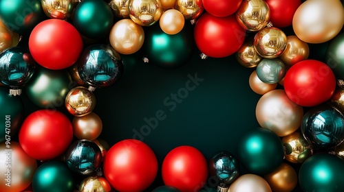 Christmas balloon arrangement with red, green, and gold colors. Festive holiday decoration, Christmas party decor, celebration atmosphere, holiday event backdrop, winter celebration.