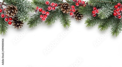 Christmas border, pine branches, frosted evergreen boughs, red berries, pinecones