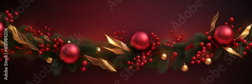 Christmas border with hanging garland of fir branches, red a, pine cones and other ornaments.