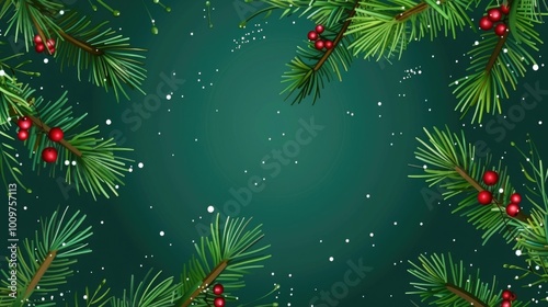 Christmas border with pine branches, red berries, and falling snowflakes on a dark green background