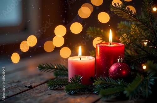 Christmas candles and Christmas tree on bokeh background with twinkling lights. A festive Christmas card.