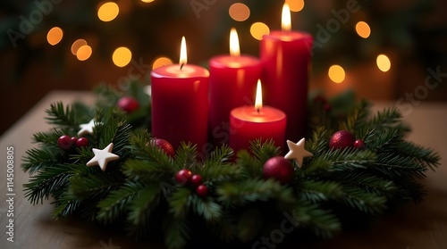Christmas Candles Surrounded by Festive Greenery, Red Berries, and Warm Holiday Glow on a Table