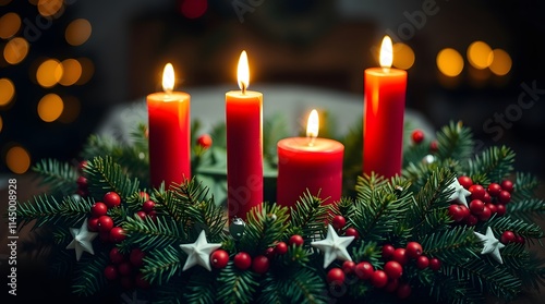 Christmas Candles Surrounded by Festive Greenery, Red Berries, and Warm Holiday Glow on a Table