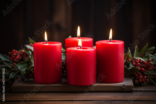 Christmas candles with fir tree branches and berries on dark wooden background.