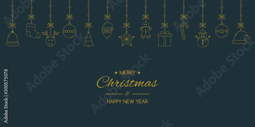 Christmas card with hanging elements and greetings. Simple Xmas ornaments. Vector