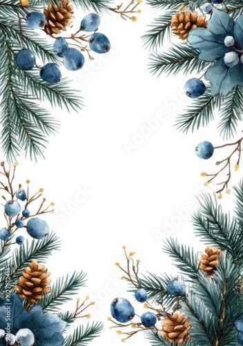 Christmas card with watercolor winter greenery, fir, spruce branches, blue leaves on white background. Rectangle frame for design. Botanical holiday border, invitation template.