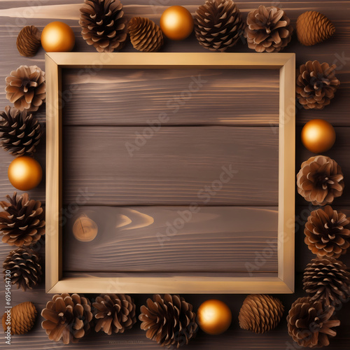Christmas composition. Christmas fir tree branches, balls, pine cones on wooden brown rustic background. Flat lay, top view. Copy space. Banner backdrop