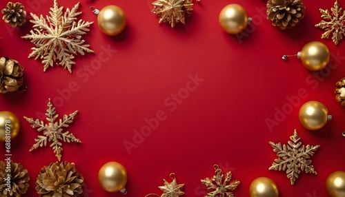Christmas composition made of christmas gold decoration on red background. Flat lay, top view