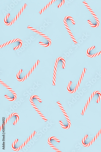 Christmas composition. Pattern made of red and white candies on blue background. Christmas, winter, new year concept. Minimal style. Flat lay, top view.