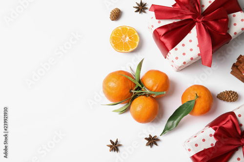 Christmas composition with gift boxes, ripe tangerines and space for text on white background, flat lay