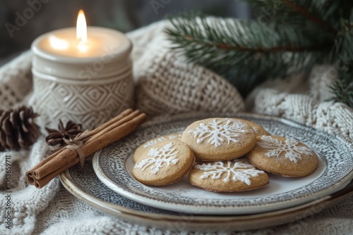 Christmas cookies with snowflake icing on a plate cinnamon sticks pine branch and candl