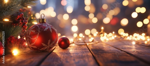 Christmas decor with ornaments and glowing bokeh lights on a wooden surface creating a warm festive atmosphere for holiday celebrations