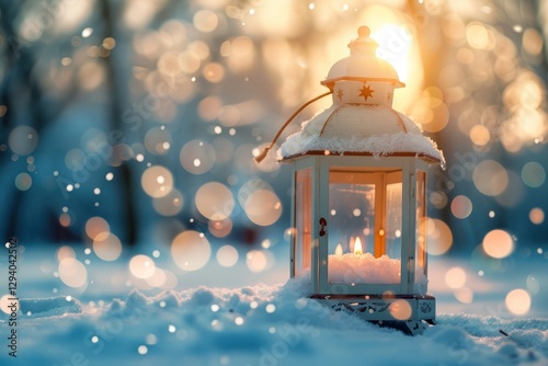 Christmas decoration with a lantern in the snow in a winter park with beautiful bokeh bokeh light.