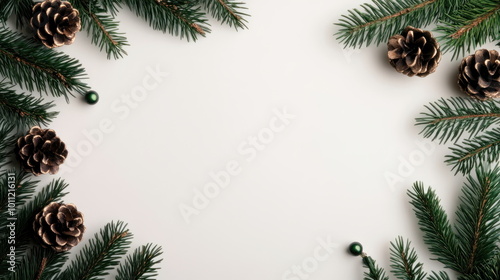 Christmas Fir Branches and Pine Cones on White Background.