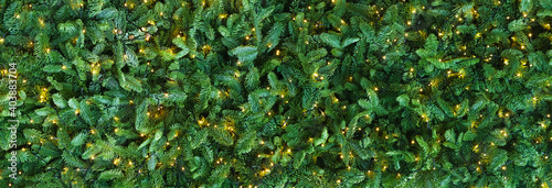 Christmas fir tree branches background. Christmas pine tree wallpaper, copy space. Festive xmas border. Glowing new year golden garland, decoration panoramic pattern
