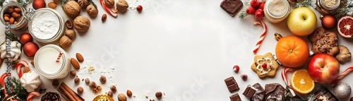 Christmas flat-lay background: nuts, flour, sugar, candy canes on the left; apples, oranges, milk, chocolate, biscuits on the right. Center left blank for text