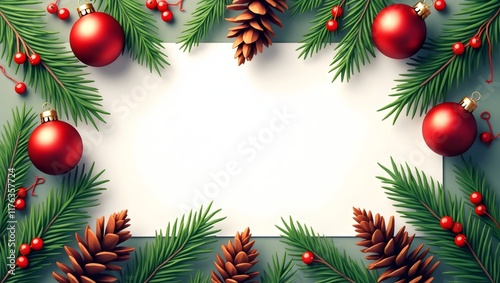 Christmas Frame With Pine Needles, Red Ornaments And Pine Cones