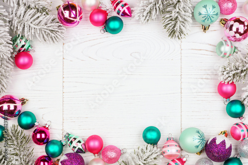 Christmas frame with pink, purple and teal baubles and tree branches. Top view on a white wood background.