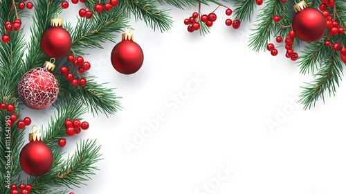 Christmas Frame with Red and Green Ornaments, Stars, Pine Branches, and Snowflakes with copyspace