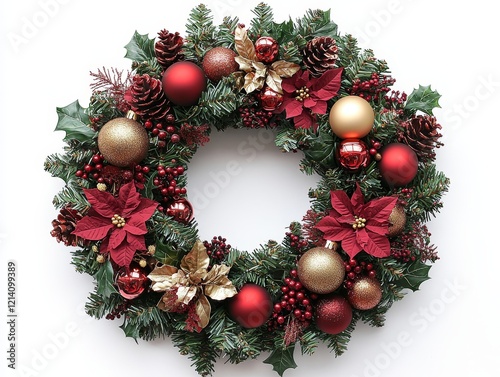 Christmas garland featuring red and gold ornaments, along with pine branches and ribbons, on a white background, available in PNG format with transparency