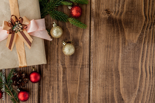 Christmas gift box, decor and fir tree branch on wooden table. Top view with copy space