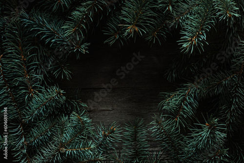 Christmas green frame from fir branches on a vintage gray board back. Frame of fir branches. Christmas card blank.