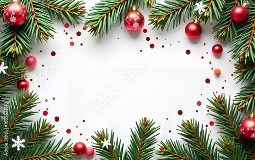 Christmas greeting card with Christmas Tree Decorations, Pine Branches, snowflake and confetti. High quality