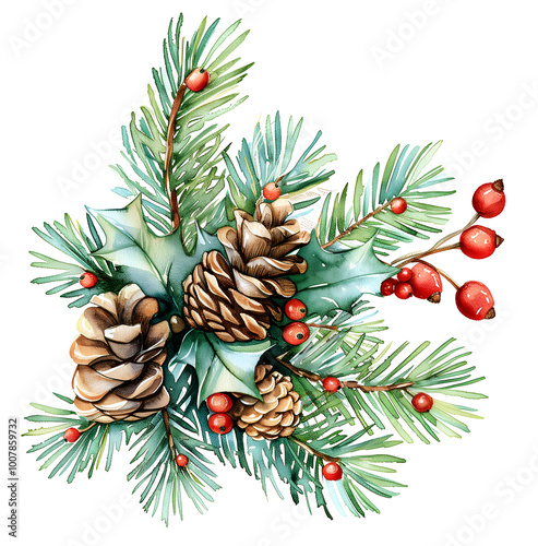 Christmas holly and pine branches with cones, a watercolor illustration on a white background.