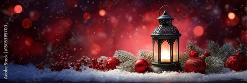 Christmas Lantern with Ornaments and Fir Branches on Snowy Table. Red Background with Copy Space.