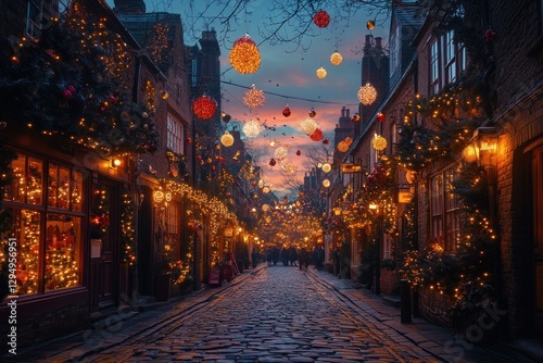 Christmas Lights and Festive Street Scene in Urban Town with Twilight Sky and Cobblestone Road