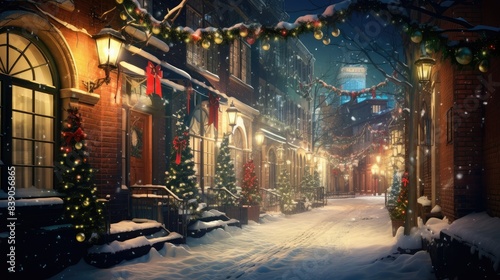 Christmas lights reflecting on a snowy street