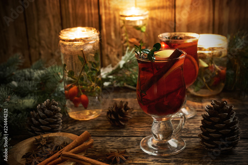Christmas mulled wine with spices on rustic wooden background