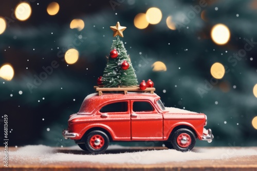 Christmas New Year card. Creative design with a toy car. A small retro vintage red car on snowy table with fir tree on roof. Generative AI. Garlands of bokeh. Side view.