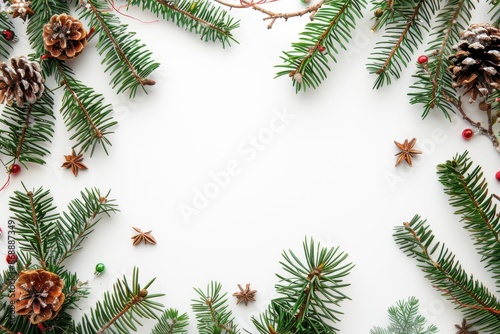 Christmas pine branches and decorations in square frame white background festive concept