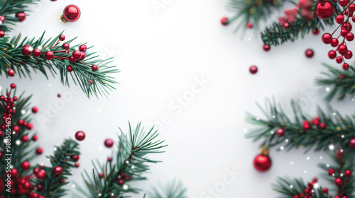 Christmas Pine Branches with Red Decor on White Table with Space for Text