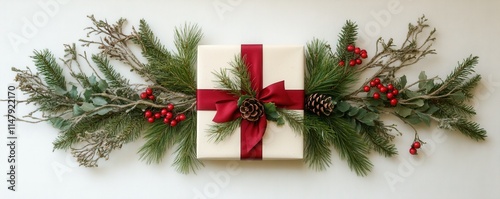 Christmas present with ribbon, berries and pine tree branches in a flat lay festive arrangement