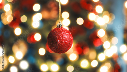 Christmas red ball against the blurred tree