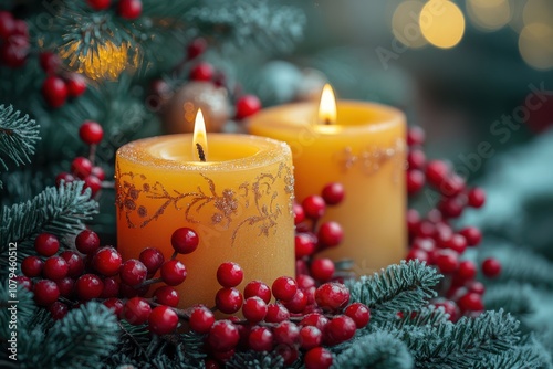 Christmas red berries and candles with green tree branches on a fuzzy background