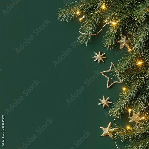 Christmas sale background or greeting card design with pine branches and stars. Xmas background with copy space. Xmas card or banner background