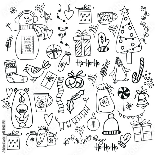 Christmas set. Design elements, children's. Cute cartoon style. New Year cards. Comfort, clothes, things, symbols, toys. Doodle style. coloring pages. clip-art advertising isolated on white background