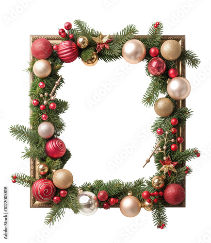 Christmas square photo frame, decorated with balls and Christmas tree branches , isolated on transparent background