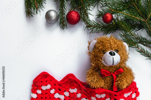 Christmas Teddy Bear near a red blanket and spruce brancheson a white background. Christmas concept.