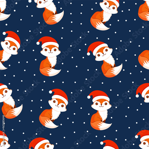 Christmas texture with festive foxes and snow. Vector illustration of Merry Christmas and Happy New Year. Seamless pattern. Winter holiday.